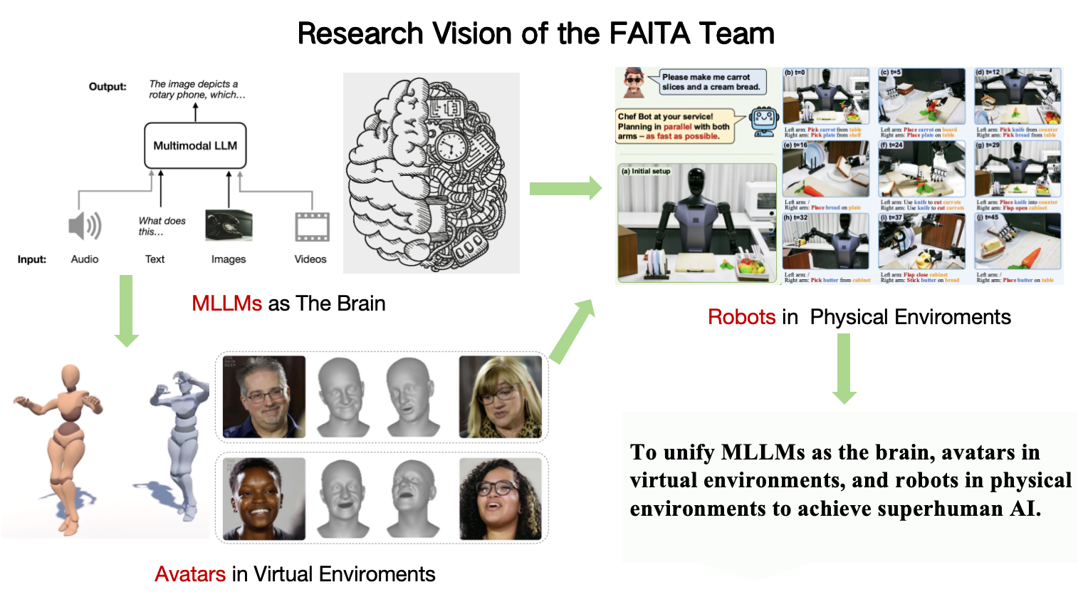 Our team focuses on human-centric artificial intelligence, with the ultimate goal of achieving intelligence that surpasses human capabilities. Currently, our research spans three key areas: Avatar, where we study human interaction and motion from a software perspective; MLLM, where we explore human cognition and thought processes through the lens of software; and Embodied AI, where we investigate how to transfer the capabilities of avatars and LLMs in virtual environments into the real world, aiming to create robots that truly exceed human performance. Through these interconnected efforts, we strive to advance the frontier of artificial intelligence and realize the vision of superhuman intelligence.